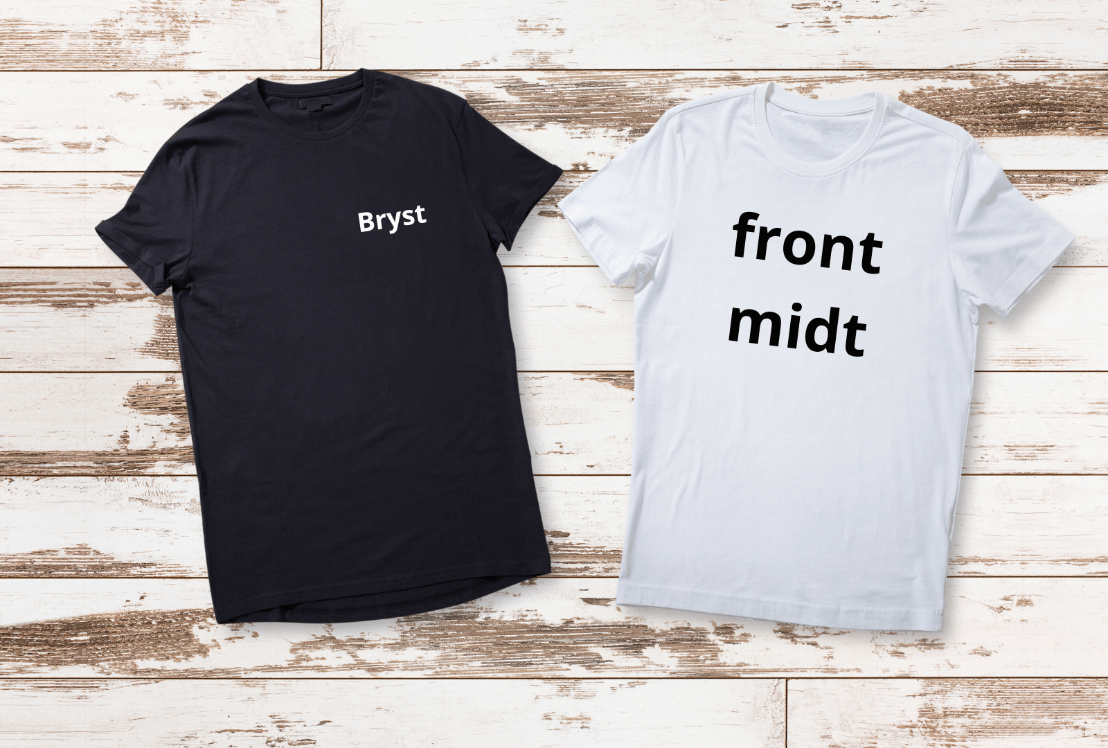 • Front midt - Bruges mest til sjove eller fjollede tekster, og billeder. Virker dog ikke for godt på tøj med lynlås, men alt efter design er der altid mulighed for tilpasning.